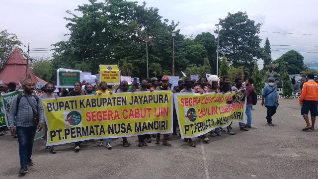 Setelah itu, sejumlah anggota masyarakat diberikan kesempatan untuk menyampaikan aspirasi. “Kami tidak mau, di atas tanah adat kami digunakan untuk perkebunan kelapa sawit, karena bagi mereka itu hanya akan merusak tanah dan hutan kami. Jadi kami minta ijin HGU segera dicabut,” ungkap Kordinator Aksi, Yustus Yekusamon dan sejumlah pendemo lainnya.