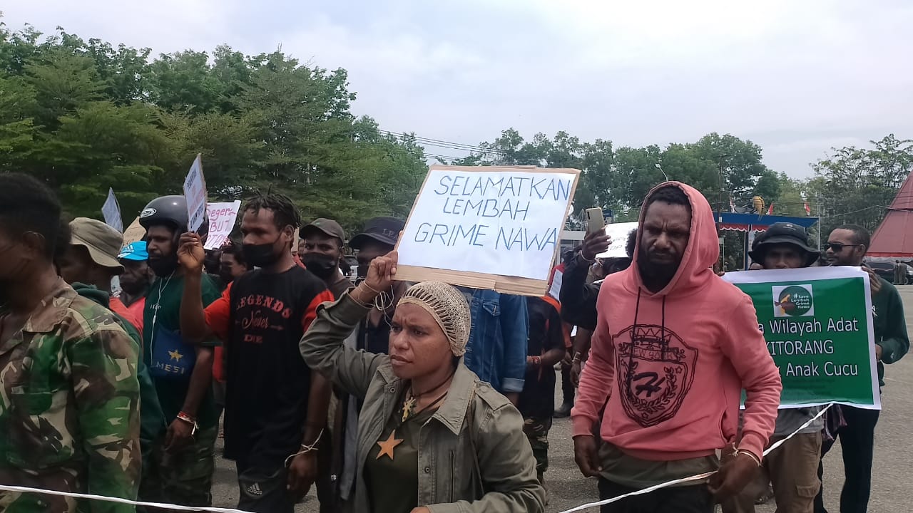Melihat jumlah massa yang semakin tumpah ruah, lalu pihak keamanan mengarahkan massa berkumpul dan menyampaikan aspirasinya di Lapangan Apel Kantor Bupati. Massa yang dipimpin Ketua Dewan Adat Grime Nawa, Mathius Sawa dan Kordinator Aksi, Yustus Yekusamon menyetujui permintaan pihak keamanan.