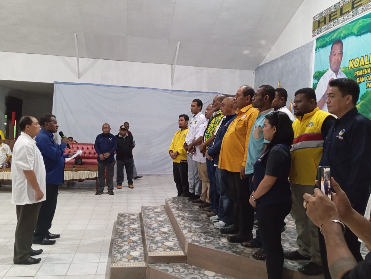 “Masyarakat juga sudah paham dan sudah mengerti bahwa dalam perolehan suara pada pileg kemarin, suara yang kami dapat baik dari Partai Golkar, Partai NasDem, Partai Gerindra, Partai Hanura dan Partai Bulan Bintang, saya kira itu sudah cukup sebagai dasar kita dalam berkompetisi dalam pemilukada yang akan berlangsung di bulan November nantinya,” tambahnya.