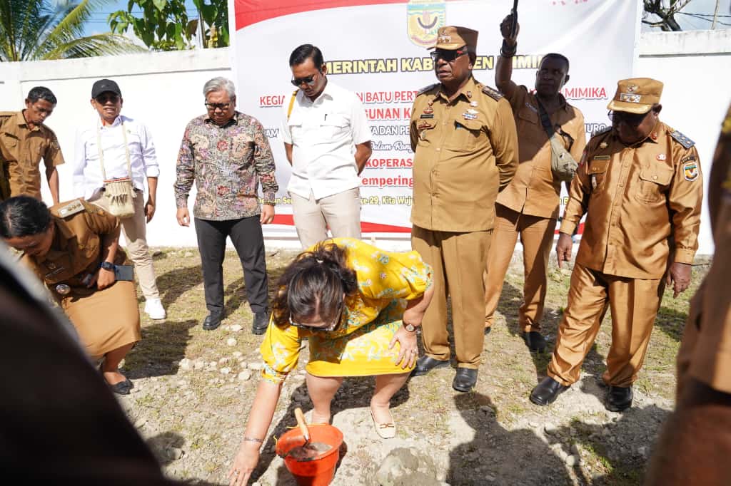 Ketua Tim Penggerak Pemberdayaan dan Kesejahteraan Keluarga Kabupaten Mimika, Susana Susi Herawati Rettob ketika meletakan baru pertama Pembangunan Koperasi Merah Putih dan disaksikan Deputi UMKM, Bupati Mimika dan Wakil Bupati.
