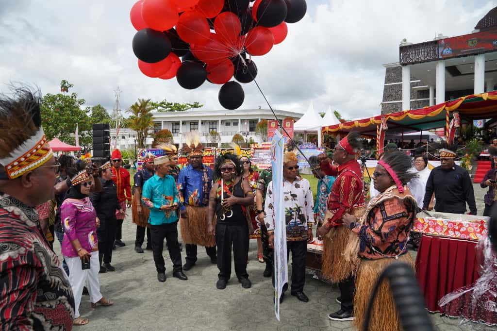 Gubernur Meky Nawipa, didampingi Bupati Mimika Johannes Rettob dan Wakil Bupati Emanuel Kemong bersama para tamu undangan melepas balon ulang tahun.