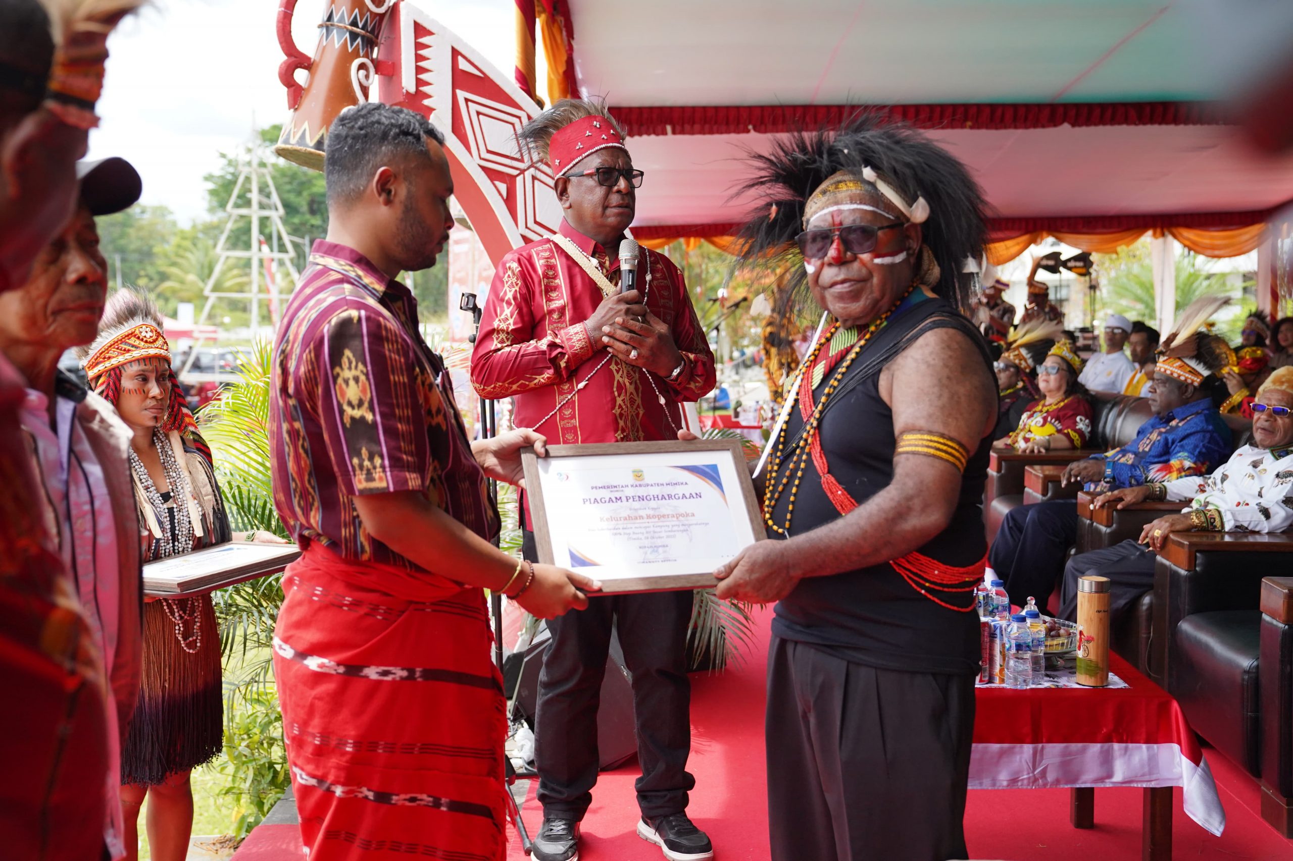 Dalam perayaan HUT Mimika ke-29, Wakil Bupati Mimika, Emanuel Kemong menyerahkan penghargaan kepada salah satu lurah.