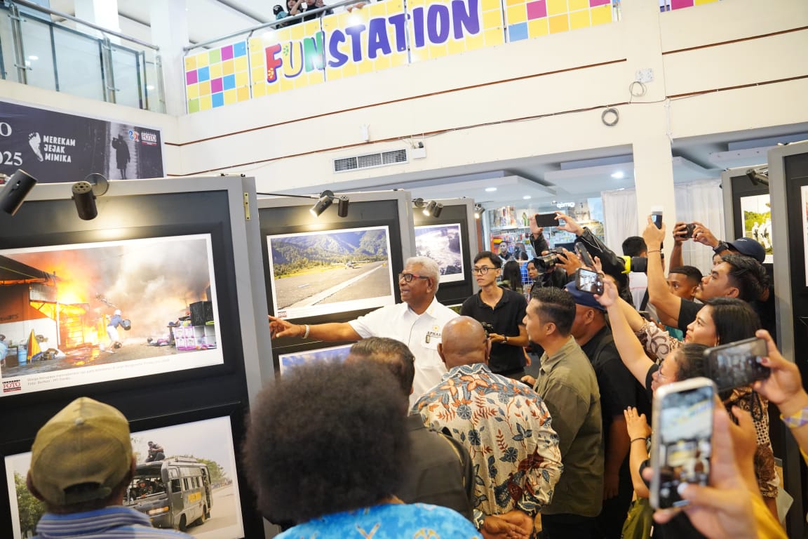 Bupati Mimika, Johannes Rettob menunjuk salah satu foto yang ditampilkan dalam Mimika Photo Eksibition 2025 yang dilakukan Pewarta Foto Indonesia (PFI) di Lantai 2 Diana Mall Timika, Jumat (10/10/2025).