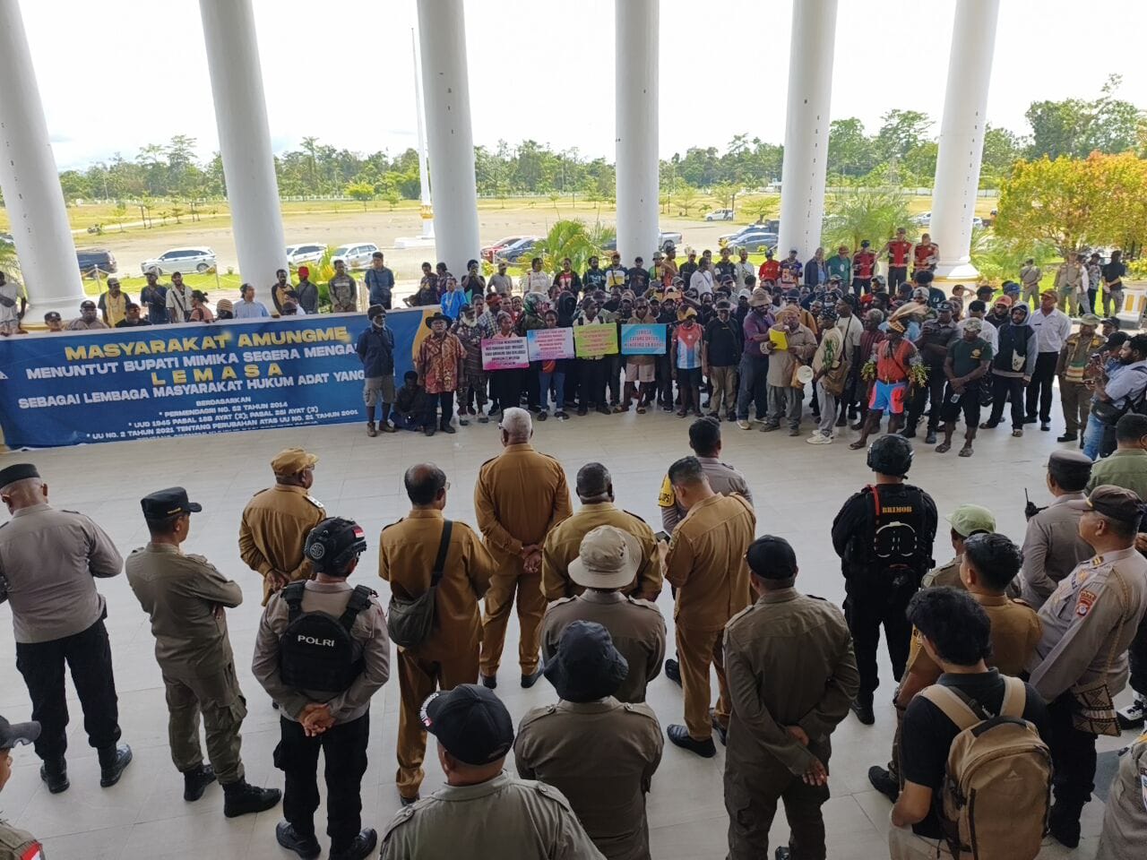 Hal ini ditegaskan Wakil Bupati Mimika, Emanuel Kemong bersama Bupati Mimika, Johannes Rettob ketika menerima para pendemo dari Lembaga Musyawarah Adat Suku Amungme (LEMASA) pimpinan Manuel John Magal saat menggelar aksi demonstrasi di Kantor Bupati Mimika, Senin 24 November 2025.