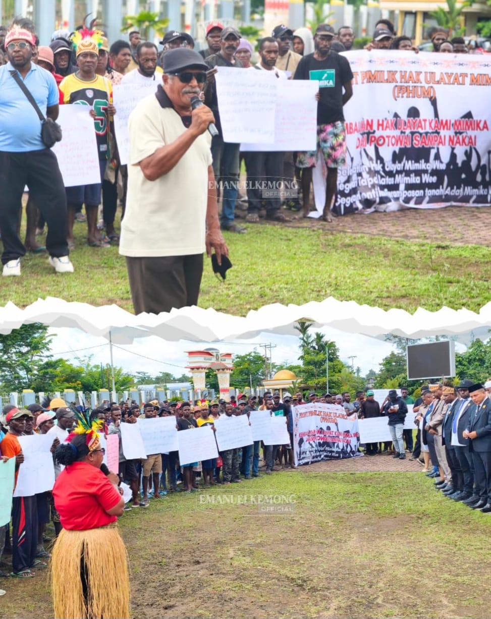 Ketua IKPPM, Petrus Yanwarin menyampaikan pendapat mewakili Keluarga Besar IKPPM di DPRK Mimika dan Natalia Ngamelubun, salah satu anak cucu perintis yang lahir besar di Mimika Barat Tengah ketika berbicara mewakili masyarakat di Wilayah Mimika Barat Tengah saat aksi di Halaman Kantor DPRD Mimika beberapa waktu lalu.