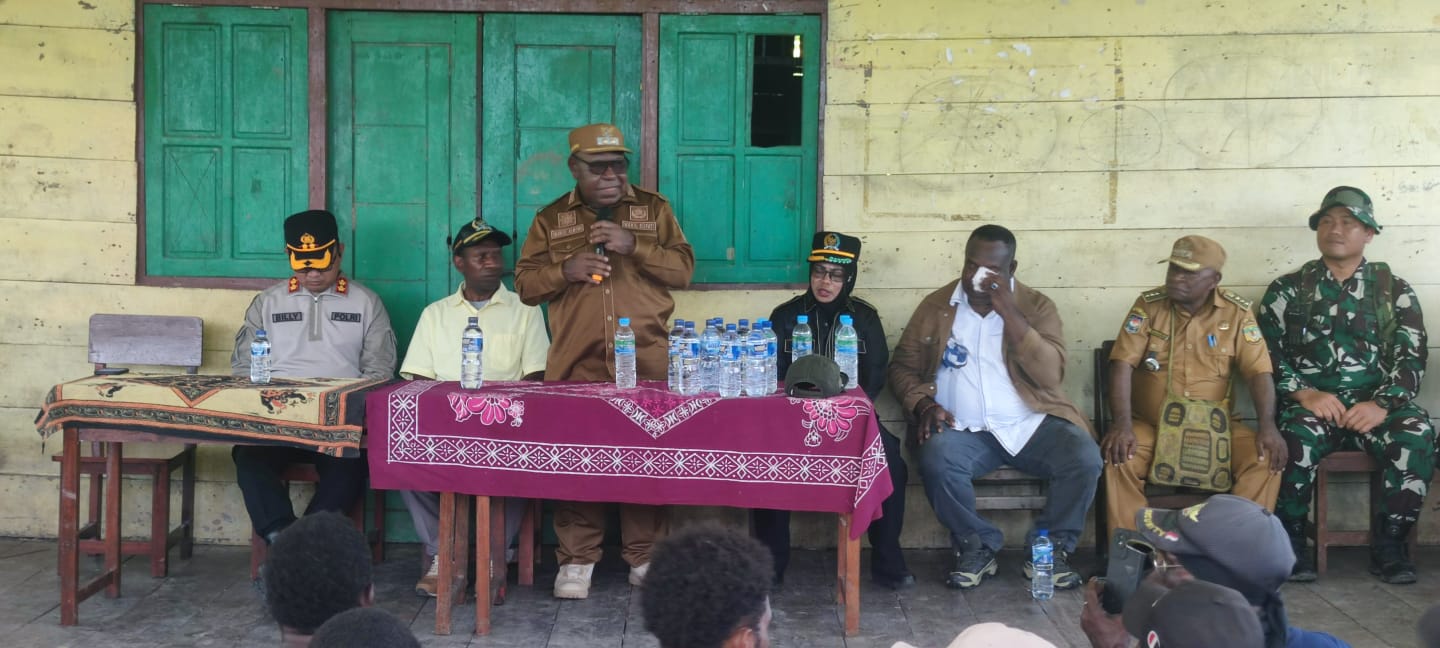 Anggota DPRK Mimika, Rampeani Rahman di sebelah kanan Wakil Bupati Mimika Emanuel Kemong bersama Forkopimda di Balai Kampung Kapiraya, Distrik Mimika Barat Tengah, Kabupaten Mimika, Papua Tengah pada Senin (1/12/2025).