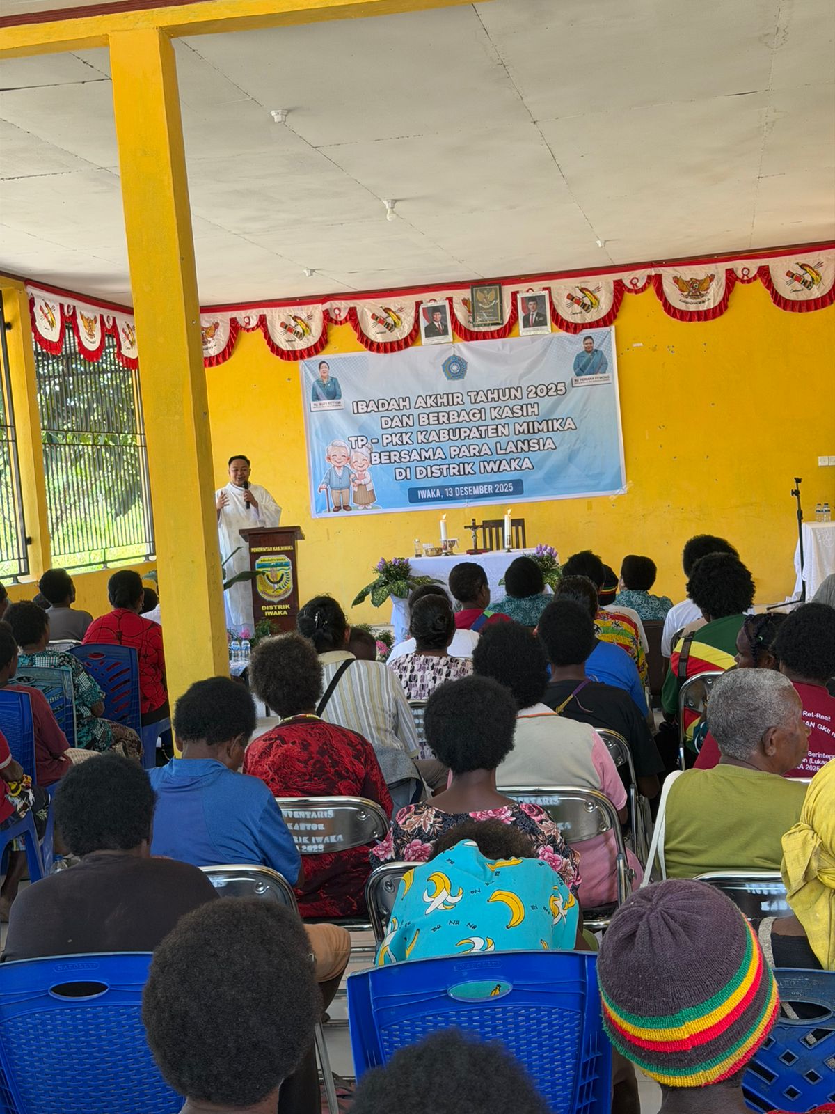 TIMIKA (13/12/25), NGK – Tim Penggerak (TP) PKK Kabupaten Mimika lakukan misa akhir tahun dan berbagi dengan para janda dan duda lansia di Distrik Iwaka, Sabtu ((13/13/2025).