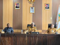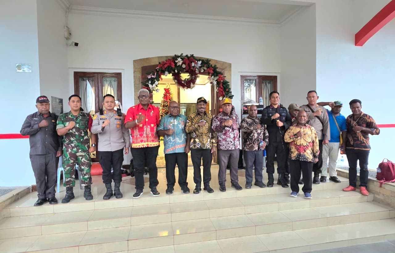 Bupati Mimika,Johanes Rettob dan Wakil Bupati, Emanuel Kemong bersama Kapolres Mimika AKBP Billyandha Hildiario Budiman dan Dandim 1710 Mimika, Letkol Redi Dwi Yuda Kurniawan saat memimpin pertemuan perdamaian dua kubuh yang berkonflik di Pendopo Rumah NegaraTimika.