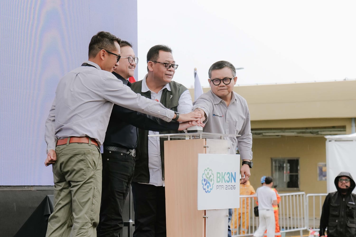 Pembukaan BK3N 2026 di PTFI ditandai dengan penekanan tombol oleh Presiden Direktur PTFI, Tony Wenas didampingi oleh Ketua Panitia BK3N 2026 area Smelter Gresik, Jimmy Purba (paling kiri), Kepala Dinas Tenaga Kerja dan Transmigrasi Provinsi Jawa Timur, Sigit Priyanto (kedua dari kanan) dan Wakil Kepala Teknik Tambang PTFI, Sony Suryanto (paling kanan). – Foto: Corcom PTFI.