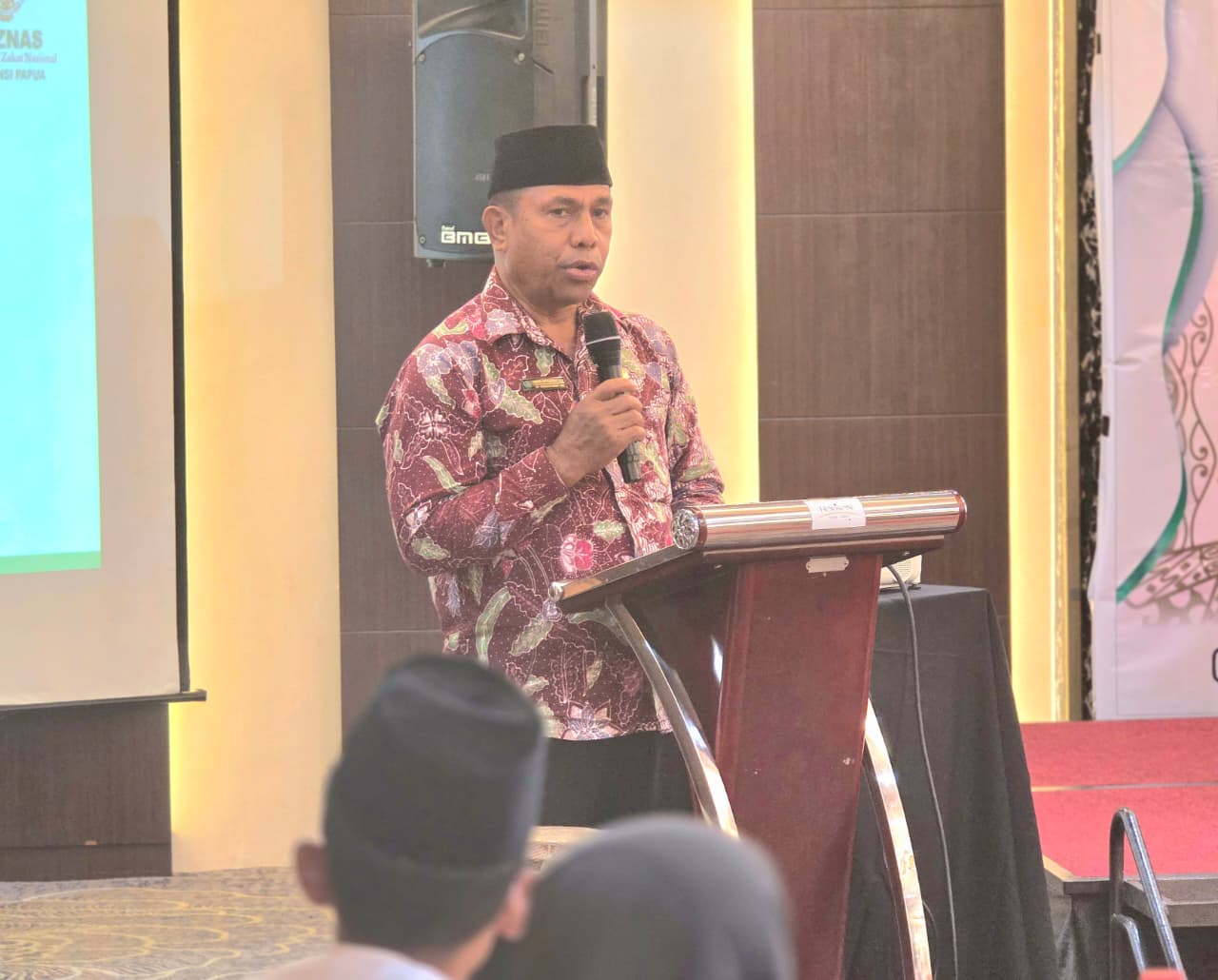 Wakil Bupati Mimika, Emanuel Kemong ketika memberikan sambutan pada kegiatan monitoring, evaluasi dan rapat kerja teknis (Rakernis) Baznas se-Provinsi Papua Raya. Kegiatan ini berlangsung di Horison Diana Timika pada Kamis, 29 Januari 2026..