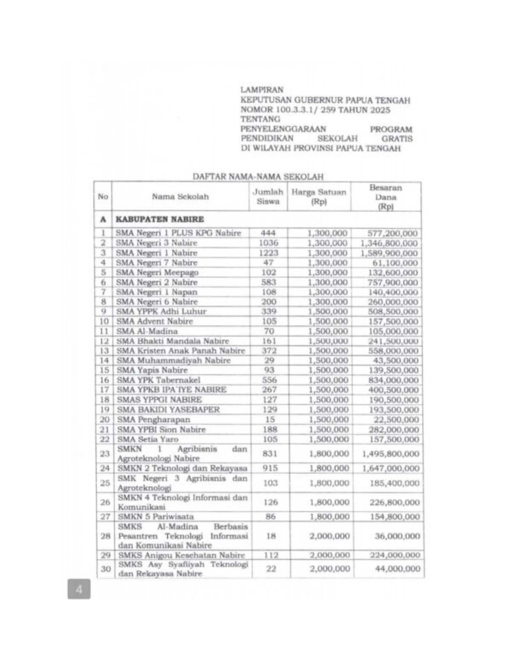 * Kabupaten Nabire: Meliputi SMA Negeri, SMA Swasta, SMK, hingga Sekolah Luar Biasa (SLB) dan asrama pelajar.