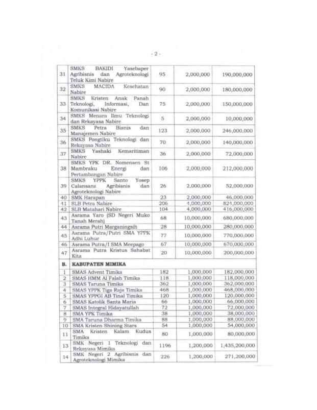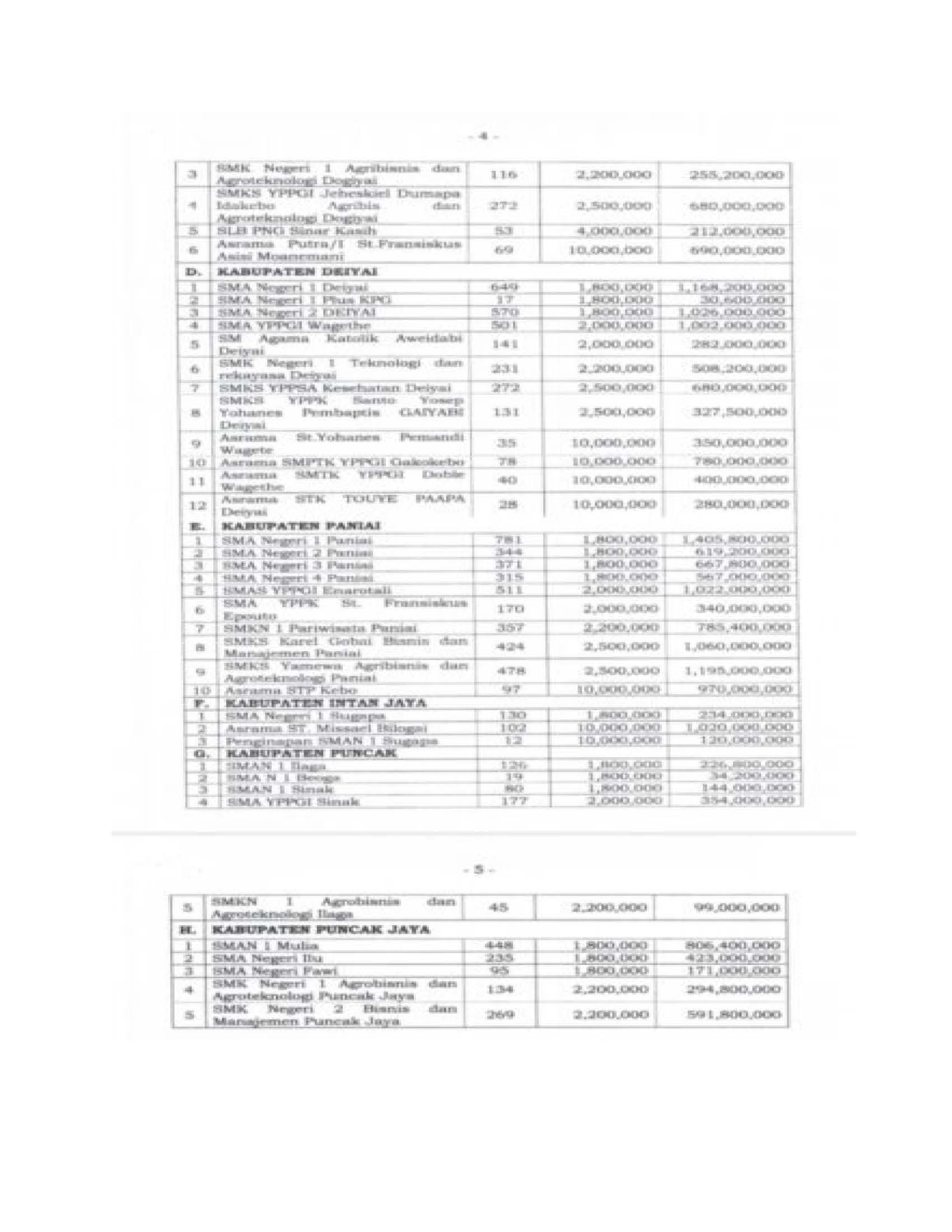 * Kabupaten Dogiyai, Deiyai dan Paniai: Termasuk SMA Negeri, SMK, dan dukungan untuk asrama putra/putri.