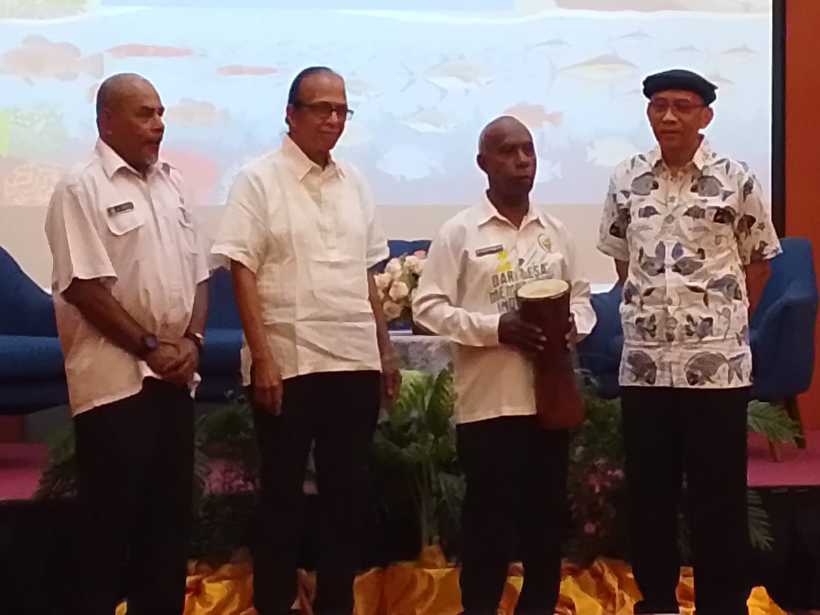 Dari kiri ke kanan: Kepala Bidang Pengelolaan Ruang Laut pada Dinas Kelautan Prov Papua – Petrus Sroyer Sroyer, Direktur ILMMA -Clift Marlessy, Asisten I Bidang Pemerintahan Kabupaten Biak Numfor – Samuel Rumakeuw dan Peneliti dari Badan Riset dan Inovasi Nasional (BRIN) – Dedi Supriadi Adburi pada pembukaan lokakarya.