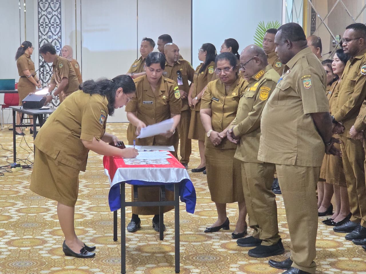Tandatangan Berita Acara Serah Terima Jabatan (Sertijab) bagi pimpinan tinggi pratama dan administrator di lingkup Pemerintah Kabupaten (Pemkab) Mimika. (Foto: Tim Multi Media Wakil Bupati)