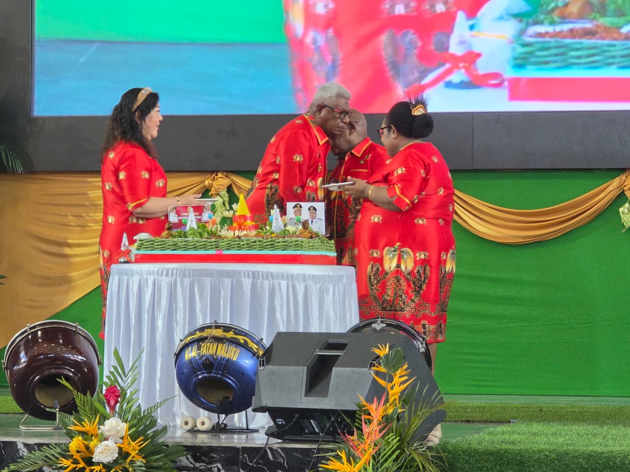 Bupati Mimika, Johanes Rettob dan Wakil Bupati, Emanuel Kemong saling berpelukan usai melakukan pemotongan tumpeng peringatan satu tahun kepemimpinan mereka disaksikan Ny Susi Rettob dan Ny Perina Kemong. (Foto: Tim Multi Media Mimika)