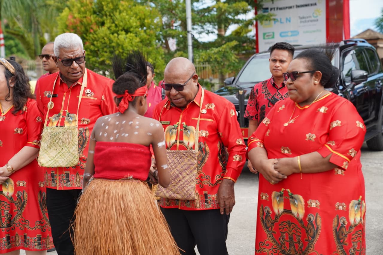 Bupati dan Wakil Bupati dijemput tim penari sekaligus mengalungkan noken kepada Bupati dan Wakil Bupati (Foto: Tim Multi Media Mimika)