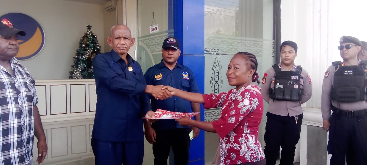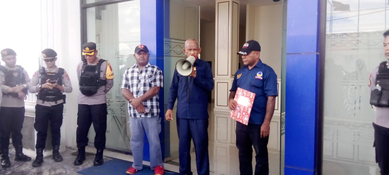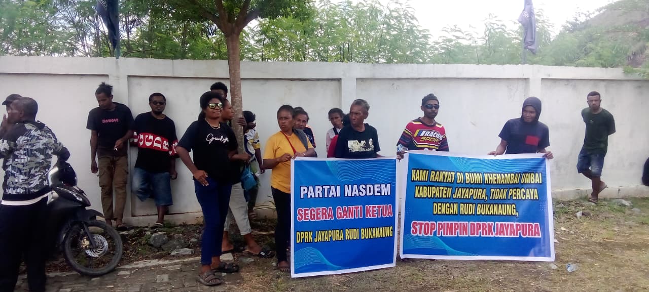 Puluhan warga yang datang dari wilayah Moy menggelar aksi demonstrasi di Kantor DPW Partai Nasdem Papua, menyuarakan mosi tidak percaya kepada Ketua DPRK Jayapura, Ruddy Bukanaung, S.E.