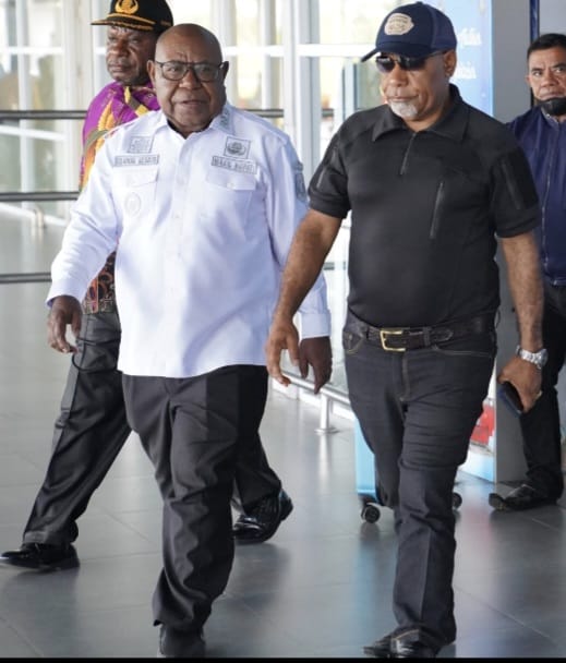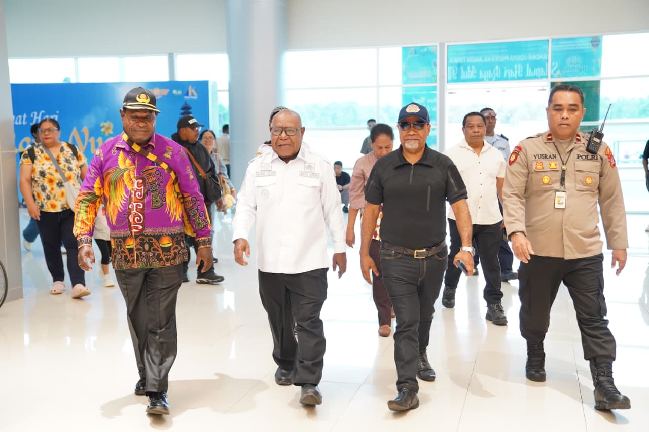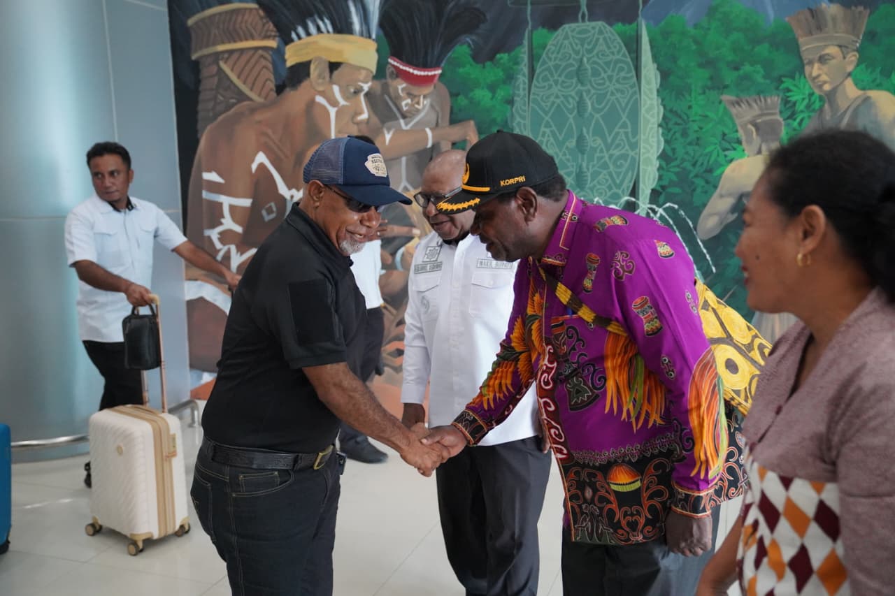 Wakil Bupati Mimika, Emanuel Kemong didampingi Kepala Dinas Koperasi dan UMKM Provinsi Papua Tengah, Yuliken Makai menyambut kedatangan Wakil Gubernur Provinsi Papua Tengah, Deinas Geley di Bandara Mozes Kilangin Timika pada Rabu (8/4/2026). Kedatangan Wakil Gubernur untuk menghadiri acara peresmian Koperasi Desa Merah Putih di Kampung Atuka, Distrik Mimika Tengah pada Kamis (9/4/2026) foto: tim multi media wakil bupati mimika