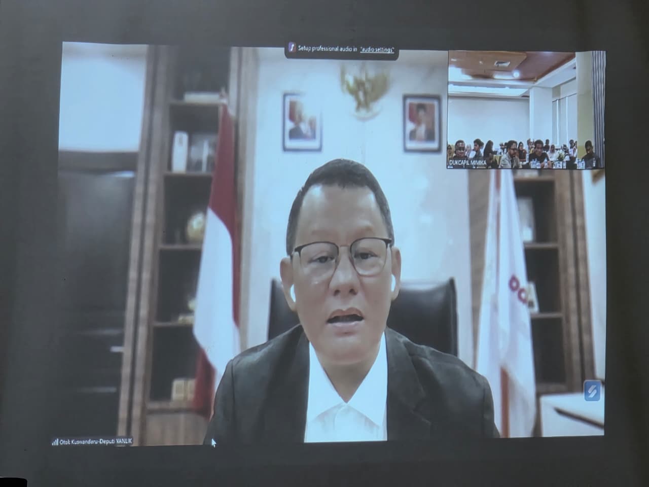 Narasumber Dr. Otok Kuswandaru, S.Sos., M.Si, Deputi Pelayanan Publik KemenPAN-RB RI. yang memberikan materi malalui zoom meeting (Foto: Tim Multi Media Wakil Bupati Mimika)