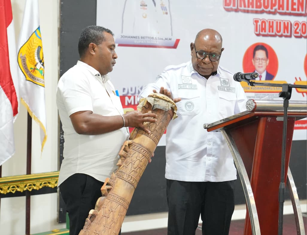 Pembukaan kegiatan Evaluasi Kinerja Pelayanan Publik di Kabupaten Mimika oleh Wakil Bupati Mimika, Emanuel Kemong ditandai dengan pemukulan tifa (Foto: Tim Multi Media Wakil Bupati Mimika)
