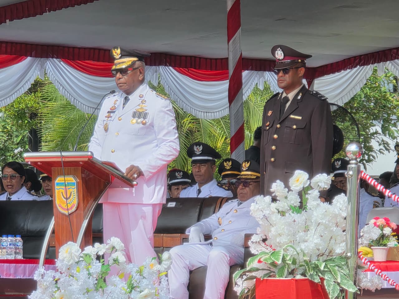 Bupati Mimika, Johanes Rettob saat memimpin upacara peringatan Hari Otonomi Daerah di Lapangan Upacara Pusat Kantor Pemerintahan SP3, Senin (27/04/2026). _ Foto: Tim Multi Media Wakil Bupati Mimika).