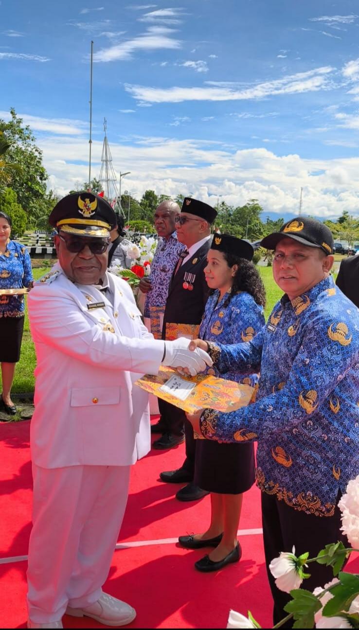 Di sela-sela Hari Otonomi Daerah ke-30 tahun ini, Wakil Bupati Mimika, Emanuel Kemong menyerahkan SK kenaikan pangkat kepada Kepala Dinas PUPR Kabupaten Mimika, Inosensius Yoga Pribadi dan dua ASN lainnya, yaitu Golongan II atas nama Samuel Rifai, Golongan III atas nama Melanesia Mediena Wihelmina Rumbiak, SKom dan satu orang terima SK Pensiun atas nama Ramly Werfete. (tob/ka)