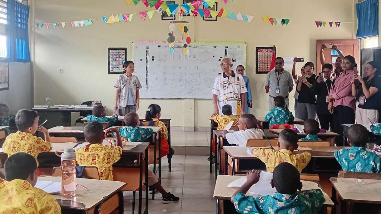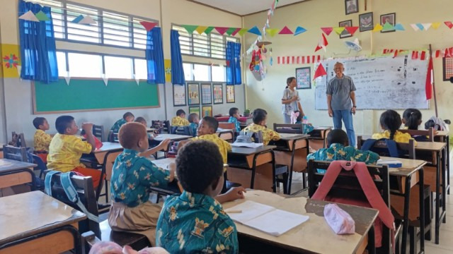 Suasana belajar Sekolah Dasar berpola asrama Yayasan Pendidikan Persekolahan Khatolik (YPPK) Santo Yohanes Pembaptis Timika, Karang Senang, SP 3, Distrik Kuala Kencana, Kabupaten Mimika, Provinsi Papua Tengah,