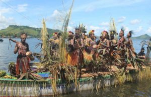 Atraksi Isosolo mengantarkan buaya hasil buruan masyarakat adat Kampung Babrongko untuk dipersembahkan kepada Ondofolo dan masyarakat Kampung Homfolo sebagai suatu kehormatan, karena sedang berlangsungnya...